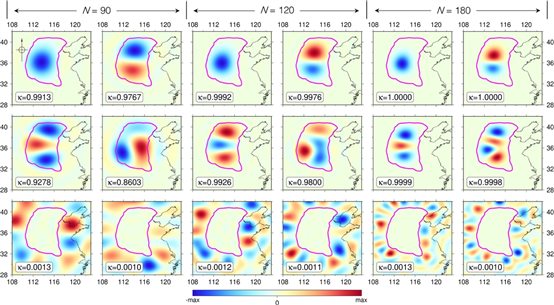 圖2進(jìn)一步給出了華北地區(qū)Slepian展開到90、120和180階時基函數(shù)的空間分布情況,其中洋紅色曲線標(biāo)記重力數(shù)據(jù)覆蓋范圍的邊界。由圖2可以看出,對于每組展開,當(dāng)聚集因子較接近1時,所對應(yīng)基函數(shù)基本都集中在研究區(qū)域內(nèi)部,能量很少泄漏到區(qū)域外部;當(dāng)聚集因子很小時(如圖2第3行中接近0.001的情況),所對應(yīng)基函數(shù)基本集中在研究區(qū)域外部,在研究區(qū)域內(nèi)部幾乎沒有貢獻(xiàn)。