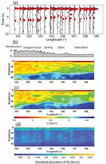 圖2 (a)用于反演的疊加P波接收函數(shù);(b) 利用阻尼最小二乘法聯(lián)合反演面波與接收函數(shù)得到的模型 (Li et al., 2017); (c)UNet 聯(lián)合反演接收函數(shù)和面波頻散得到的模型 (d) 由100個(gè)預(yù)測模型導(dǎo)出的不確定度