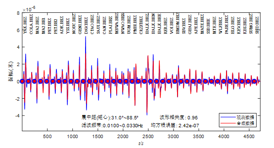 矩心矩張量反演采用了震中距30.97°~88.53°范圍的39道寬頻帶多分量體波數(shù)據(jù),基于時空網(wǎng)格搜索+同步源反演確定了矩心位置、矩張量解與其對應(yīng)的震源時間函數(shù),獲得的最優(yōu)模型結(jié)果顯示,此次地震的標(biāo)量地震矩為1.0393×10^19N.m、矩震級Mw6.61,矩心坐標(biāo)為北緯29.55°、東經(jīng)120.14°、矩心深度16.0km。斷層面解為節(jié)面I走向163°/傾角77°/滑動角-5°,節(jié)面II走向254°/傾角85°/滑動角-167°。最佳雙力偶成分絕對占比97%,觀測數(shù)據(jù)與合成數(shù)據(jù)整體相關(guān)度為0.96。