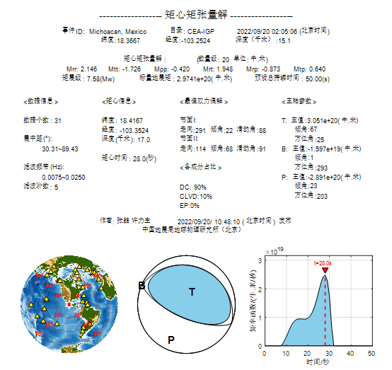 張喆等的矩心矩張量反演采用了震中距30.31°~89.43°范圍的31道長周期垂直分量體波數(shù)據(jù),基于時(shí)空網(wǎng)格搜索和同步源反演確定了矩心位置、矩張量解與其對應(yīng)的震源時(shí)間函數(shù),獲得的最優(yōu)模型結(jié)果顯示,此次地震的標(biāo)量地震矩為2.9741×1020牛·米、矩震級Mw 7.58,矩心坐標(biāo)為北緯18.4167度、西經(jīng)103.3524度、矩心深度17.0公里。斷層面解為節(jié)面I走向291°/傾角22°/滑動(dòng)角88°,節(jié)面II走向114°/傾角68°/滑動(dòng)角91°。雙力偶成分占比90%,補(bǔ)償偶極分量占比10%,觀測數(shù)據(jù)與合成數(shù)據(jù)整體相關(guān)度為0.96。
