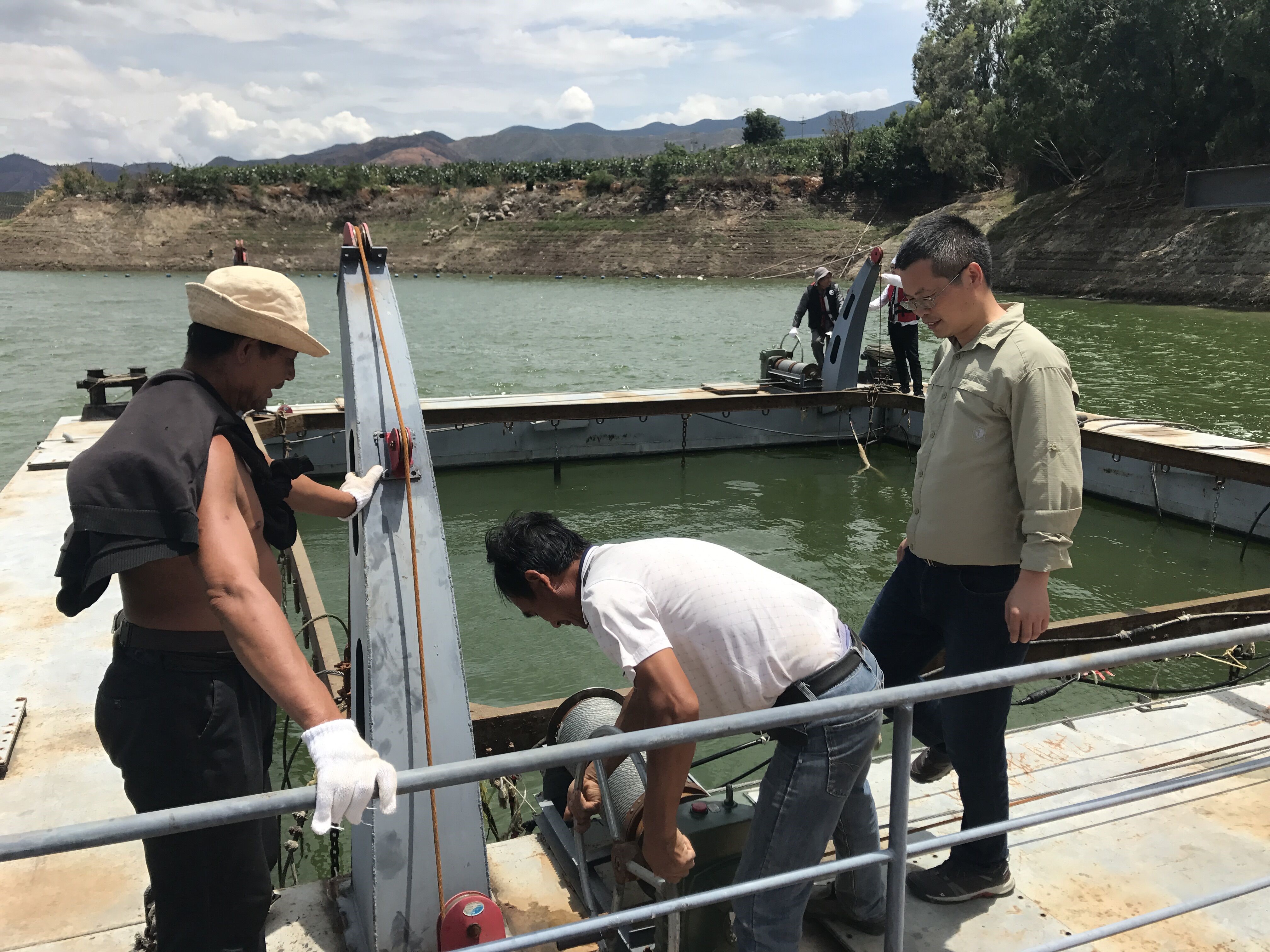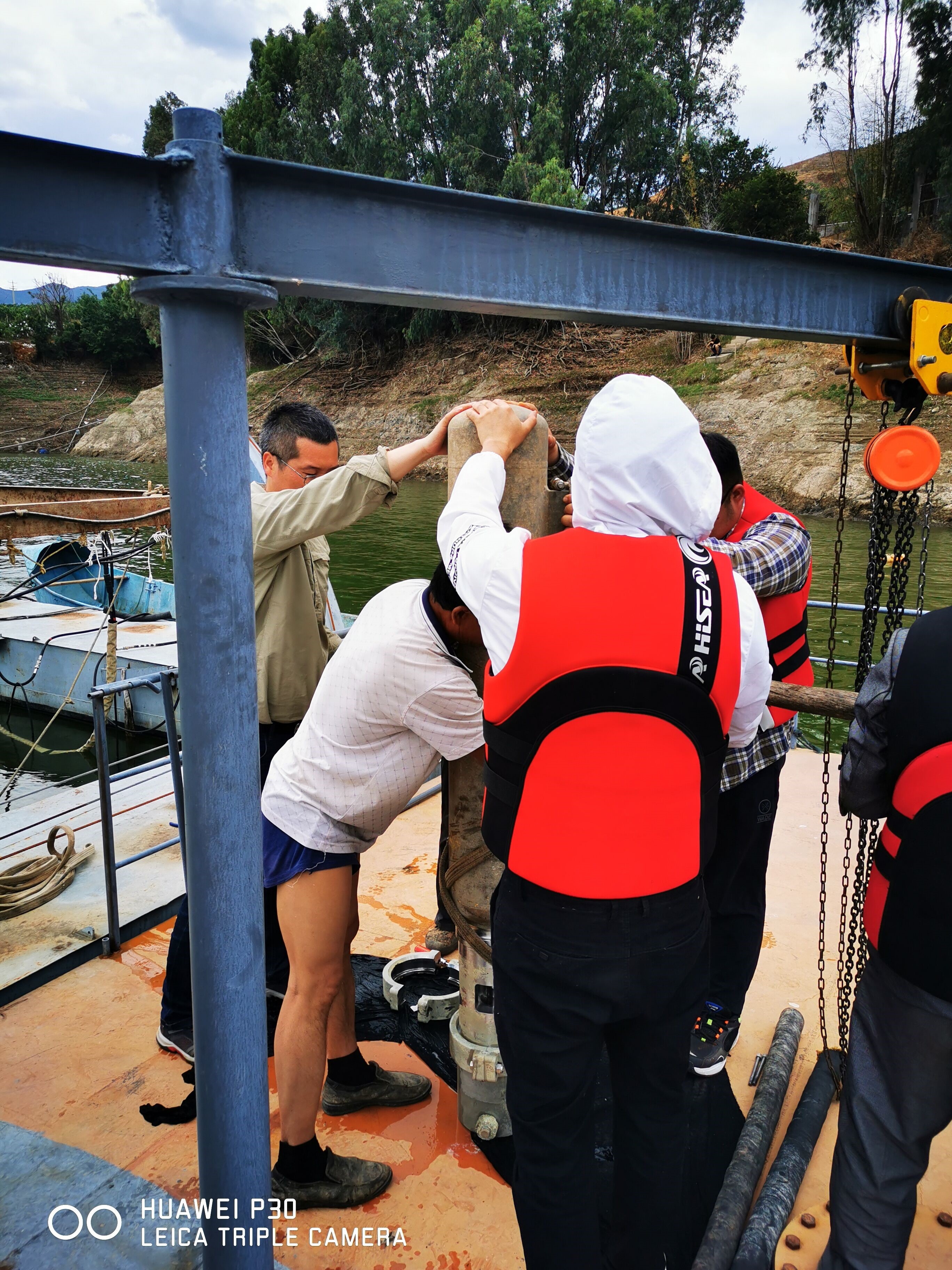 工作期間,為獲得更為精確的結(jié)果,大家將氣槍激發(fā)頻次由每30分鐘一次加密至12分鐘一次,并根據(jù)小組成員業(yè)務(wù)熟練程度,分組輪流在觀測(cè)基地日夜堅(jiān)守值班。在觀測(cè)期間,因氣槍臨時(shí)出現(xiàn)障礙,以楊微同志為代表的共產(chǎn)黨員們,身先士卒,克服余震不斷和高氣溫的困難,帶領(lǐng)大家集思廣益,最終將氣槍修理完善,保證了工作的正常開(kāi)展。氣槍是安置在水庫(kù)中,需要通力合作,先導(dǎo)技術(shù)研究室博士生蘇金波、朱冰清、劉世爍緊急趕到,積極配合開(kāi)展現(xiàn)場(chǎng)工作。