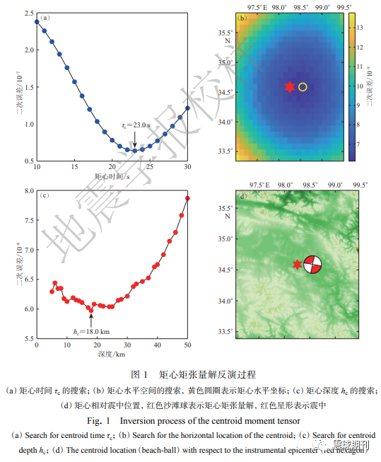 本研究收集震中距處于30°-90°范圍內的全球地震臺網(GSN)和寬頻帶數字臺網聯盟(FDSN)共435道長周期多分量數據作為初始觀測資料,經多次迭代篩選,最終選取震中距處于31.58°-89.51°范圍內的77道數據作為反演資料,利用AK135模型計算相應的格林函數(Wang,1999)。根據震級與半持續(xù)時間特征選用頻帶范圍為0.006 7-0.033 Hz的長周期P波。為滿足速報需求,這里采用我們慣用的網格搜索方法(張喆等,2020;張喆,許力生,2021)在震后短時間內實現了快速反演,得到了相關參數,如圖1所示。