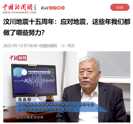 5月10日,高孟潭研究員以專家身份參加中國(guó)地震學(xué)會(huì)科學(xué)普及工作委員會(huì)、科學(xué)技術(shù)部中國(guó)21世紀(jì)議程管理中心共同組織策劃的科普訪談節(jié)目《地震科學(xué)大家談》,面向公眾傳播防震減災(zāi)地震科學(xué)知識(shí),共同提高全社會(huì)防范地震災(zāi)害風(fēng)險(xiǎn)能力,累計(jì)播放量500余萬次。5月12日,中國(guó)新聞網(wǎng)對(duì)高孟潭研究員進(jìn)行題為《汶川地震十五周年:應(yīng)對(duì)地震,這些年我們都做了哪些努力?》專訪,深度解讀過去十五年,中國(guó)在抗震防災(zāi)方面做的新探索,得到社會(huì)大眾的廣泛關(guān)注,累計(jì)播放量約78萬次。
