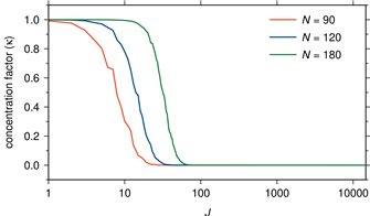圖1 華北地區(qū)對應(yīng)90、120和180階Slepian展開的聚集因子分布