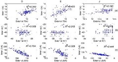 圖(a)所用地磁臺站分布圖;(b)每年各季節(jié)外源Sq電流體系圖像;(c)每年各季節(jié)內(nèi)源Sq電流體系圖像;(d)北半球外源(黑色曲線)和內(nèi)源(紅色曲線)電流渦中心參數(shù)地方時T、緯度Φ、電流強度J季節(jié)變化;(e)北半球外源(黑色曲線)和內(nèi)源(紅色曲線)電流渦中心參數(shù)地方時T、緯度Φ、電流強度J季節(jié)變化;(f)北半球內(nèi)源和外源電流渦中心參數(shù)T、Φ、J的相關(guān)散點分布;(g)南半球內(nèi)源和外源電流渦中心參數(shù)T、Φ、J的相關(guān)散點分布。