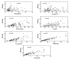 圖2 隔震層位移響應(yīng)與地震動強度指標的相關(guān)性 |