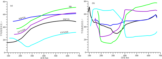 圖2 模型預(yù)測的不同區(qū)域的(a)地幔對流速度方向和(b)地幔最大水平拉張速率方向與快波方向之間的平均角度差異隨深度的變化。