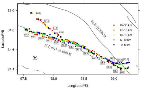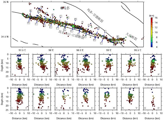 圖1瑪多地震序列震中和震源深度剖面