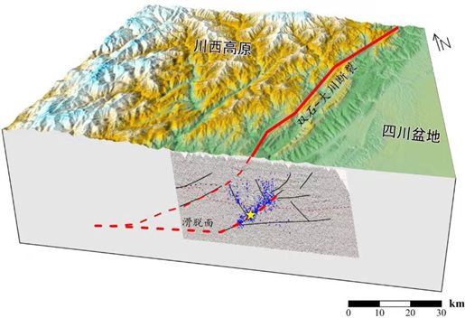 圖4 2013年蘆山MS7.0地震的余震精定位結(jié)果和發(fā)震構(gòu)造示意圖。圖中黃色五星為主震震源位置、藍(lán)色圓點為余震精定位后的位置。結(jié)果來自地球物理研究所牽頭的中國地震局四川蘆山7.0級地震科學(xué)考察工作報告。