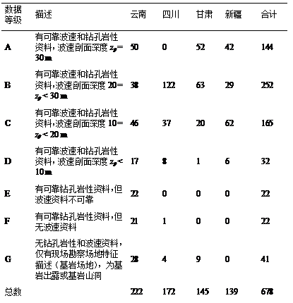 中國地震局地球物理研究所謝俊舉研究員團(tuán)隊(duì)系統(tǒng)整理和匯編了中國西部地區(qū)云南、四川、甘肅和新疆共678個(gè)強(qiáng)震動(dòng)臺(tái)站建臺(tái)報(bào)告和場地巖土勘察報(bào)告中的場地鉆孔和波速測試資料(637個(gè)有鉆孔巖性或波速資料),工作內(nèi)容包括鉆孔巖性和波速資料收集、資料數(shù)字化(柱狀圖和波速剖面)、臺(tái)站基礎(chǔ)信息核實(shí)(位置、經(jīng)緯度,是否建臺(tái)、遷址、停用或更名)、場地資料核實(shí)(波速可靠性)。按照鉆孔巖性和剪切波速數(shù)據(jù)可靠性和可用性進(jìn)行場地?cái)?shù)據(jù)分級(jí)(表1),建立了中國西部地區(qū)強(qiáng)震動(dòng)臺(tái)站的場地巖性、波速和場地分類數(shù)據(jù)集。數(shù)據(jù)集提供場地資料的強(qiáng)震動(dòng)臺(tái)站分布如圖1所示。數(shù)據(jù)集獲取地址:https://zenodo.org/record/5750972