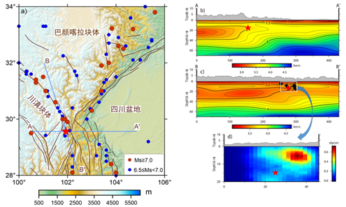 地震學(xué)家通常借助地震波所攜帶的信息,在不破壞地球的前提下探測地球內(nèi)部結(jié)構(gòu)。一般認(rèn)為,地震波速度越高代表巖石強度越大,反之亦然。從四川瀘定6.8級地震震源區(qū)地殼速度結(jié)構(gòu)來看,青藏高原東部中、下地殼(20-50 km深度)地震波速度相對較低,而四川盆地中、下地殼速度(20-40 km深度)地震波速度相對較高。此次地震正是發(fā)生在高、低速過渡帶上(圖1a, b),也說明了不同地質(zhì)塊體地殼結(jié)構(gòu)差異對區(qū)域應(yīng)力積累起著重要的控制作用。