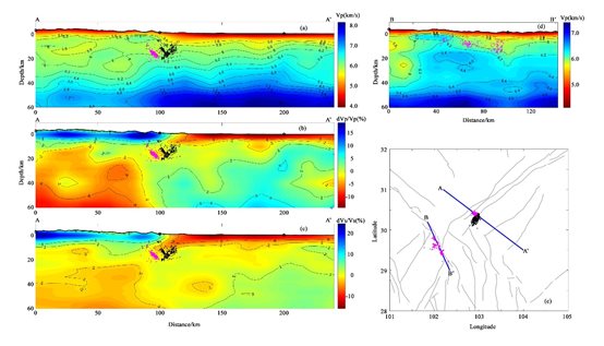 圖2 2022年蘆山地震和瀘定地震震源區(qū)附近的殼幔速度結(jié)構(gòu)和余震分布圖