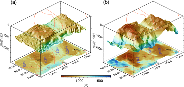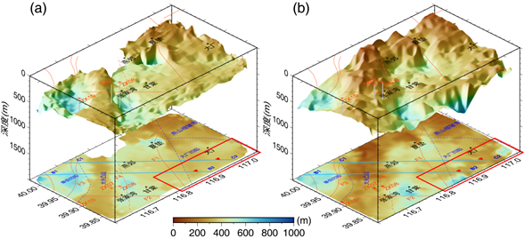 圖1 北京城市副中心及周邊地區(qū)剪切波速度等深面(a)和沉積層厚度(b)
