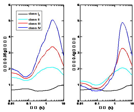 圖3 弱震動和強震動作用下場地影響調整系數(shù)(相對于中國I1類場地的地震動反應譜調整模型)