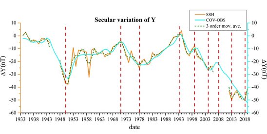 1950、1971、1978年地磁急變事件的發(fā)現(xiàn),進(jìn)一步證實(shí)此三次急變事件在中國臺(tái)站的存在,尤其是1950年的急變事件在我國地磁臺(tái)站尚屬首次發(fā)現(xiàn),對(duì)于確認(rèn)該事件的全球性特征具有重要意義。本項(xiàng)工作獲得的佘山臺(tái)歷史數(shù)據(jù)急變是地磁場(chǎng)長期變化的主要特征,研究表明jerk與地球日長變化(LOD)的周期性變化存在一定的對(duì)應(yīng)關(guān)系,急變可能會(huì)導(dǎo)致LOD延長。如果將數(shù)據(jù)應(yīng)用到急變預(yù)測(cè)模型的構(gòu)建和研究中,對(duì)于深入了解地球磁流體動(dòng)力學(xué)問題具有重要意義。
