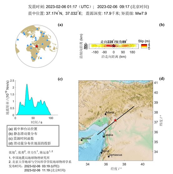 張喆等的矩心矩張量反演采用了震中距24.36°~89.13°范圍的52道長(zhǎng)周期多分量體波數(shù)據(jù),基于時(shí)空網(wǎng)格搜索和同步源反演確定了矩心位置、矩張量解與其對(duì)應(yīng)的震源時(shí)間函數(shù),獲得的最優(yōu)模型結(jié)果顯示,此次地震的標(biāo)量地震矩為6.7857×1020牛·米、矩震級(jí)Mw為7.82,矩心坐標(biāo)為北緯37.29度、東經(jīng)37.09度、矩心深度23.0公里,矩率函數(shù)峰值時(shí)刻為第26秒。斷層面解為節(jié)面I:走向151°/傾角088°/滑動(dòng)角175°,節(jié)面II:走向241°/傾角085°/滑動(dòng)角002°。雙力偶成分占比94%,觀測(cè)數(shù)據(jù)與合成數(shù)據(jù)整體相關(guān)度為0.94。