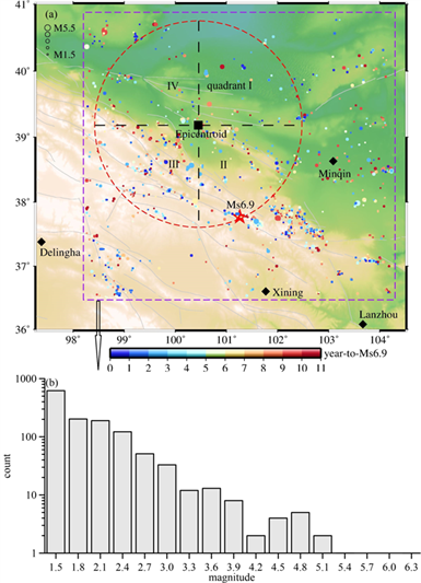 圖2 (a)門源地震震中周圍絕對(duì)重力站(黑色菱形所示)剩余重力變化的等效質(zhì)量源區(qū)(紅色圓圈所示),圓點(diǎn)表示2011-2021年歷史地震(M≥1.5)震中位置,圓點(diǎn)顏色表示發(fā)震時(shí)刻到門源6.9級(jí)地震的時(shí)間;(b)震中周圍區(qū)域((a)中紫色方框)歷史地震震級(jí)頻度圖