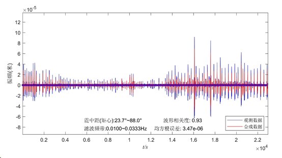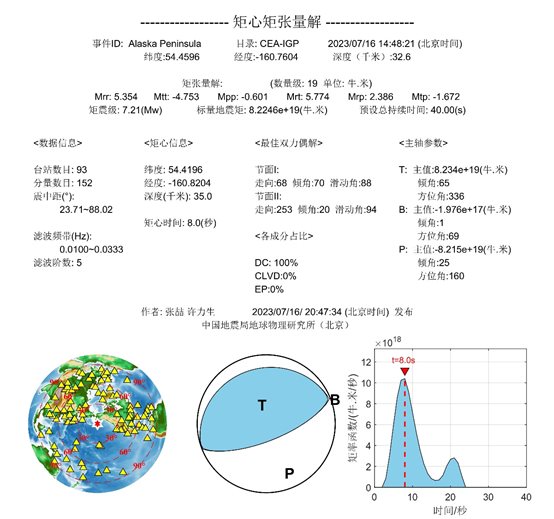 張喆等的矩心矩張量反演采用了震中距23.71°~88.02°范圍的152道長周期多分量體波數(shù)據(jù),基于時空網(wǎng)格搜索和同步源反演確定了矩心位置、矩張量解與其對應的震源時間函數(shù),獲得的最優(yōu)模型結(jié)果顯示,此次地震的標量地震矩為8.2246×1019牛·米、矩震級Mw為7.21,矩心坐標為北緯54.42度、西經(jīng)160.82度、矩心深度35.0公里,矩率函數(shù)峰值時刻為第8秒。斷層面解為節(jié)面I:走向152°/傾角073°/滑動角-176°,節(jié)面II:走向253°/傾角020°/滑動角094°。雙力偶成分占比接近100%,觀測數(shù)據(jù)與合成數(shù)據(jù)整體相關(guān)度為0.93。
