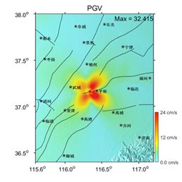 基于震源運(yùn)動(dòng)學(xué)模擬方法,結(jié)合華北東部地區(qū)地殼P波速度三維結(jié)構(gòu)模型,開(kāi)展了此次地震近場(chǎng)強(qiáng)地震動(dòng)模型研究,初步模擬結(jié)果與強(qiáng)震動(dòng)觀測(cè)結(jié)果以及烈度分布相吻合(圖6)。