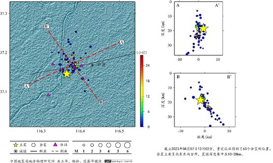 截止2023年08月07日12時(shí)02分,獲得了63個(gè)余震的位置,余震序列精定位結(jié)果表明,余震略呈北東東向分布,震源深度集中在10公里至28公里。