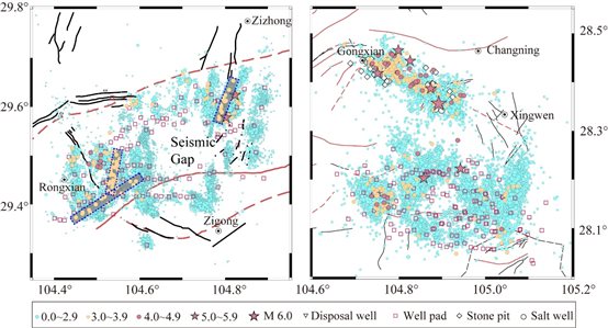 M<5.0級地震用圓點表示;M≥5.0級地震用五角星表示。根據(jù)中國衛(wèi)星資源識別的一些水力壓裂鉆井平臺位置用紅色正方形表示。