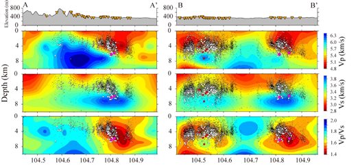 圖4 威遠(yuǎn)地區(qū)沿AA’和BB’測線的Vp、Vs和 Vp/Vs結(jié)構(gòu)垂直剖面圖(剖面位置見正文圖4)