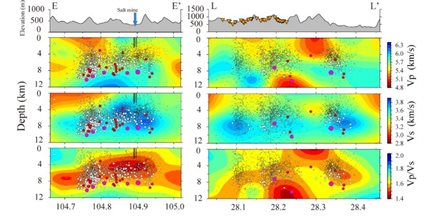 圖6 威遠(yuǎn)(上圖)和長寧頁巖氣開采區(qū)(中圖)、以及長寧鹽礦開采區(qū)(下圖)地震震源區(qū)的Vp、Vs和Vp/Vs值分布圖