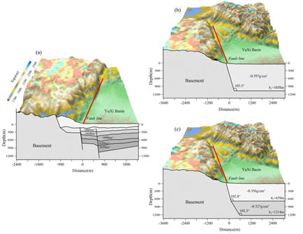 普渡河斷裂南端位于玉溪盆地內(nèi)部,具有典型的傾滑斷層特征,斷層右側(cè)被沉積物覆蓋,斷層兩層物質(zhì)密度差異導(dǎo)致了顯著的局部重力異常。團(tuán)隊(duì)以地震剖面的結(jié)果作為先驗(yàn)認(rèn)識(shí),分別以單層模型和雙層模型為基礎(chǔ)模擬斷層系統(tǒng),以局部重力異常為觀測(cè)數(shù)據(jù)反演獲得兩種參數(shù)的最優(yōu)值。結(jié)果表面,對(duì)于普渡河斷裂,雙層模型在擬合觀測(cè)數(shù)據(jù)上相比于單層模型沒(méi)有顯著的提升,且復(fù)雜模型評(píng)估的沉積物埋深顯著大于參考數(shù)據(jù)。因此,研究認(rèn)為單一斷層模型更適合用于表示普渡河斷裂特征。