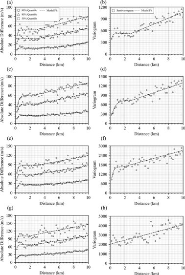 山前地形的鉆孔剖面剪切波速空間函數(shù)散點(diǎn)和擬合曲線(xiàn)圖。左側(cè)圖為QVAD函數(shù),右側(cè)圖為半變異函數(shù)。自上至下分別為5米、10米、20米、30米深度處的結(jié)果。