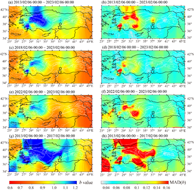 圖1 土耳其MW7.8-7.6地震發(fā)生前不同時(shí)段的b值分布及絕對(duì)中位差(MAD)