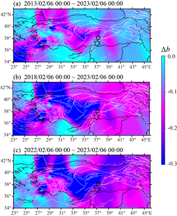 圖2 土耳其MW7.8-7.6地震發(fā)生前不同時(shí)段的Δb值分布