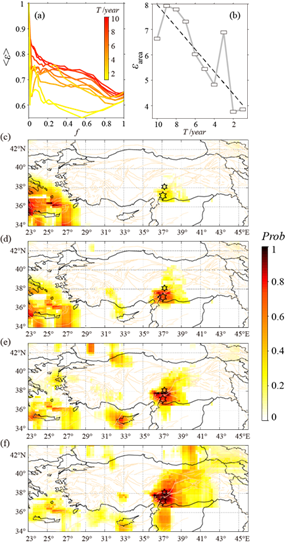 中國(guó)地震局地球物理研究所尹鳳玲副研究員、蔣長(zhǎng)勝研究員,針對(duì)土耳其MW7.8-7.6雙震事件的孕育過(guò)程是否可在大范圍空間尺度上識(shí)別問(wèn)題,利用定量描述地震活動(dòng)遷移過(guò)程的累積圖像遷移(Cumulative Migration Pattern, CMP)方法進(jìn)行了研究。相關(guān)研究采用了基于數(shù)據(jù)驅(qū)動(dòng)的TbDD方法進(jìn)行b值計(jì)算,利用參考時(shí)段與背景值的差值Δb作為輸入,定量計(jì)算地震活動(dòng)遷移的危險(xiǎn)性概率分布,并從多角度對(duì)結(jié)果的穩(wěn)定性進(jìn)行了驗(yàn)證。