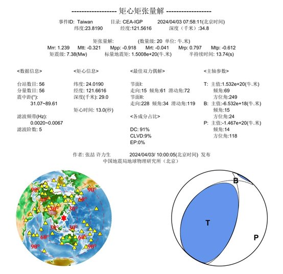 張喆等的矩心矩張量反演采用了震中距 31.07°~ 89.61°范圍內(nèi)56道長周期多分量W-phase數(shù)據(jù),基于網(wǎng)格搜索確定了矩心時空位置與矩張量解,獲得的最優(yōu)模型結(jié)果顯示,此次地震的標(biāo)量地震矩為1.5008×1020牛﹒米、矩震級Mw為7.38,矩心坐標(biāo)為北緯24.02度、東經(jīng)121.66度、矩心深度29.0公里,矩心時刻為13.0秒。斷層面解為節(jié)面I:走向015°/傾角061°/滑動角072°,節(jié)面II:走向228°/傾角034°/滑動角119°。雙力偶成分占比91%,觀測數(shù)據(jù)與合成數(shù)據(jù)整體相關(guān)度為0.94。