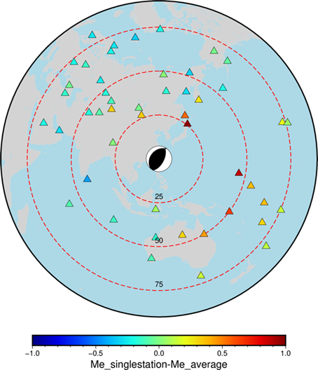 劉瑞豐研究員等利用全球地震臺網(wǎng)(GSN)提供的寬頻帶記錄,基于能流密度法開展了此次花蓮地震的震源參數(shù)測定工作。結(jié)果顯示,本次地震的輻射能量為5.6×1015焦耳,折合為能量震級Me 7.6,結(jié)合張喆給出的矩震級Mw 7.38可知Me大于Mw,該地震作為一次逆沖型地震,震源輻射地震能量的效率偏高,與相似矩震級的地震相比,造成震動的能力較強(qiáng),存在引發(fā)局部海嘯的風(fēng)險。