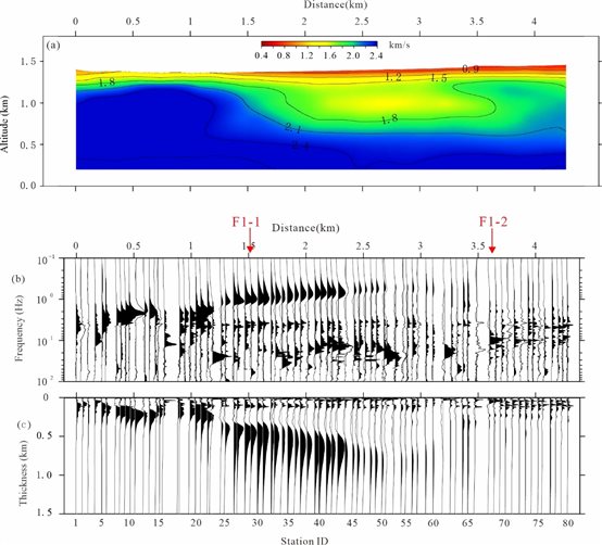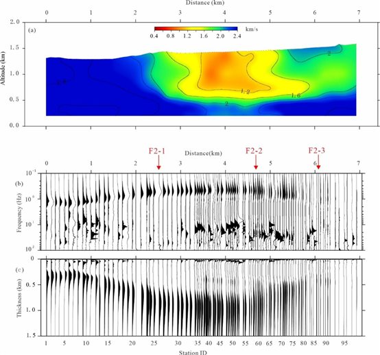圖2期納測(cè)線下方的剪切波速度結(jié)構(gòu)(a)、HVSR曲線(b)及沉積層厚度情況(c)