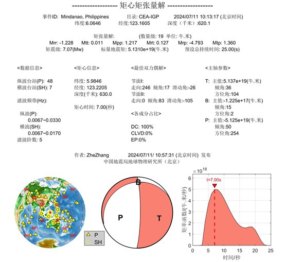 據(jù)中國(guó)地震臺(tái)網(wǎng)正式測(cè)定,北京時(shí)間7月11日10時(shí)13分(當(dāng)?shù)貢r(shí)間7月11日10時(shí)13分)在菲律賓棉蘭老島附近海域發(fā)生7.0級(jí)地震,震源深度620公里,震中位于北緯6.10度,東經(jīng)123.30度。地震發(fā)生后,中國(guó)地震局地球物理研究所研究人員通過(guò)矩心矩張量解反演和破裂過(guò)程反演,獲得了地震的震源特征認(rèn)識(shí)。