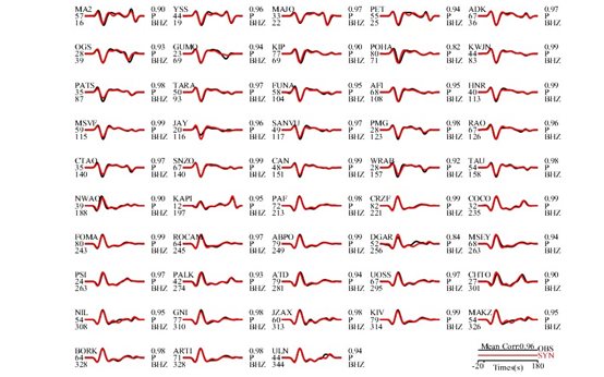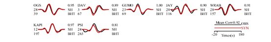 張喆等的矩心矩張量反演采用了震中距 2.60°~ 81.77°范圍內(nèi)48道寬頻帶P波數(shù)據(jù)以及7道寬頻帶SH波數(shù)據(jù),基于網(wǎng)格搜索確定了矩心時(shí)空位置與矩張量解,獲得的最優(yōu)模型結(jié)果顯示,此次地震的標(biāo)量地震矩為5.1310×1019牛·米、矩震級(jí)Mw為7.07,矩心坐標(biāo)為北緯5.98度、東經(jīng)123.22度、矩心深度630.0公里。斷層面解為節(jié)面I:走向246°/傾角017°/滑動(dòng)角-026°,節(jié)面II:走向000°/傾角081°/滑動(dòng)角-105°。雙力偶成分占比接近100%,P波與SH波觀測(cè)數(shù)據(jù)與合成數(shù)據(jù)平均相關(guān)度分別為0.96與0.92。