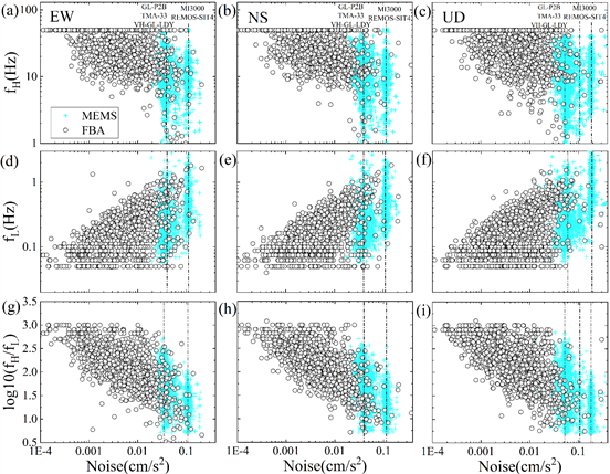 1)MEMS和FBA兩類傳感器均呈現(xiàn)隨峰值地面加速度(PGA)增大,記錄的可用頻帶變寬的特點(diǎn),其中FBA具有更寬的有效帶寬(背景噪聲水平介于10-4–0.1 cm/s2,反映環(huán)境噪聲特征);2)MEMS記錄呈現(xiàn)以儀器噪聲為主導(dǎo)的聚集型噪聲分布,可劃分為兩類:低噪聲儀器(0.04–0.06 cm/s2)和與美國加州社區(qū)地震網(wǎng)絡(luò)(CSN)噪聲水平相當(dāng)?shù)母咴肼晝x器;3)壁掛式布設(shè)較地面布設(shè)平均噪聲水平提升1–1.5倍,但垂直分量噪聲有微弱降低。