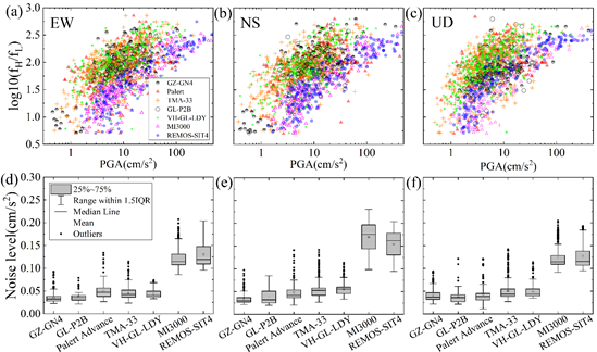 圖3 預(yù)警臺網(wǎng)7種MEMS烈度計(jì)采用壁掛式安裝時(shí)記錄的可用帶寬(a)-(c)與噪聲水平(e)-(f)。圖中左、中、右三列分別對應(yīng)東-西(EW)、北-南(NS)和上-下(UD)分量的分析結(jié)果。