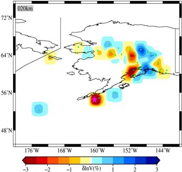 阿拉斯加州以南海域位于太平洋板塊與北美板塊的匯聚邊界,太平洋板塊向陸側(cè)低角度俯沖,是典型的俯沖帶構(gòu)造環(huán)境。經(jīng)過震源區(qū)的速度結(jié)構(gòu)切片顯示:主震區(qū)域的波速幅值最低,可能表明含水沉積物、流體及部分熔融等作用,加速了主震區(qū)的應(yīng)力積累及破裂擴(kuò)展。