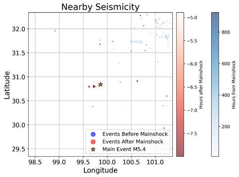 趙明等利用諦聽大模型震相自動拾取定位法產(chǎn)出的2025年10月9日四川甘孜州新龍縣5.4級地震震前、主震、震后自動AI地震目錄。其中,包括震前39天(2025年9月1日-2025年10月9日,主震3度范圍內(nèi))目錄195個,主要分布在主震東北方向300km以外,主震附近無明顯前震活動;震后截止16點自動定位余震6個,最大余震4.6級,其分布如圖所示。