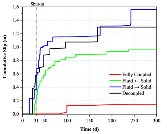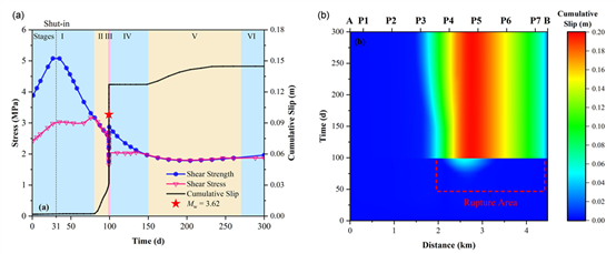 中國(guó)地震局地球物理研究所祝愛玉研究員團(tuán)隊(duì),研發(fā)了一套滲流-應(yīng)力-速率-狀態(tài)摩擦全耦合的高精度數(shù)值模擬方法。該方法采用全隱式耦合求解方案,同步求解位移、孔隙壓力、滑動(dòng)速率等核心變量,能夠再現(xiàn)工業(yè)注采過程中斷層滑移的全序列演化,完整刻畫了從無震滑移到地震破裂的轉(zhuǎn)變過程?;谠撃P偷南到y(tǒng)數(shù)值實(shí)驗(yàn),揭示了延遲誘發(fā)地震的關(guān)鍵物理機(jī)制:在停注之后,盡管孔隙壓力擴(kuò)散顯著減慢,但孔彈性效應(yīng)引發(fā)的體積壓縮仍會(huì)沿?cái)鄬泳徛齻鞑???紫秹毫U(kuò)散、孔彈性應(yīng)力傳遞與區(qū)域構(gòu)造背景應(yīng)力在時(shí)空上的協(xié)同作用,使得斷層某些區(qū)段的剪切應(yīng)力與有效正應(yīng)力之比先達(dá)到失穩(wěn)臨界條件,從而觸發(fā)延遲地震。這一機(jī)制解釋了野外觀測(cè)中“孔隙壓力峰值位置與最大同震滑動(dòng)位置不一致”的常見現(xiàn)象。