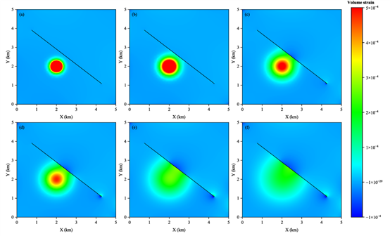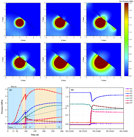 圖2 (a-f)孔隙壓力擴(kuò)散特征;(g-h)斷層中點(diǎn)的孔隙壓力隨時(shí)間的變化