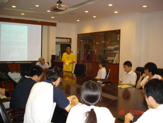 報告和提問結(jié)束后,Kim教授聽取了各位研究生對自己研究工作的簡單介紹,并與大家進行了座談。2004級碩士研究生榮棉水同學(xué)主持了本次活動,外事辦公室主任蘇小蘭、第八研究室吳慶舉研究員也參加了本次活動。
