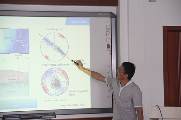楊濤研究員首先給播放了一段實驗室模擬斷裂帶發(fā)生地震時的現(xiàn)象的視頻,并對斷層泥做了細致的介紹,其指出,斷層泥可以揭示斷層的演化和結(jié)構(gòu)信息。楊濤研究員主要就巖石磁學(xué)這一學(xué)科進行了講解,巖石磁學(xué)是研究巖石磁性的學(xué)科,可以得到巖石初始環(huán)境和地質(zhì)過程的信息,巖石磁性的影響因素很多,包括礦物種類、含量及晶體結(jié)構(gòu)等。在應(yīng)力作用、機械摩擦、摩擦生熱和流體滲入等的影響下,巖石在宏觀上會表現(xiàn)出磁性的改變,故此可以利用巖石磁學(xué)來得到斷層的信息。最后,楊濤研究員以實際的幾個例子(2008年汶川大地震、2011年東日本大地震、1995年日本神戶大地震等)從不同的角度講述了如何利用巖石磁學(xué)方法得到應(yīng)力狀態(tài)、熱歷史、流體作用和古地震信息。