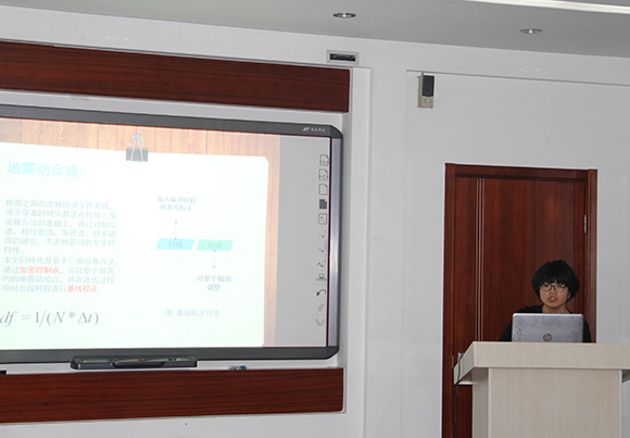 博士研究生冀戰(zhàn)波首先做了關(guān)于“新疆呼圖壁地區(qū)的近地圍陷波觀(guān)測(cè)與特征研究”的報(bào)告;碩士研究生陳三紅做了題為“場(chǎng)地地震反應(yīng)分析中的頻率相關(guān)等效線(xiàn)性化方法研究”的報(bào)告。報(bào)告從場(chǎng)地地震反應(yīng)分析方法、合成地震動(dòng)和地震動(dòng)正、反演三個(gè)方面展開(kāi)。